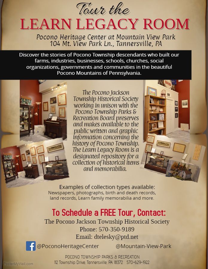 The Pocono Heritage Center in Mountain View Park provides a community meeting place for all in Pocono Township and the surrounding communities. It is also home to the Legacy Room which holds a treasure trove of historical documents and artifacts from the families who founded our community.